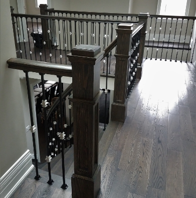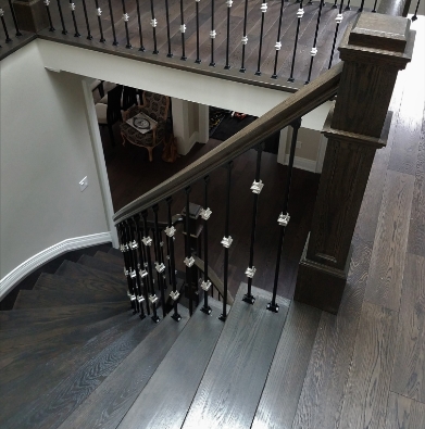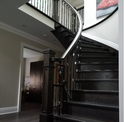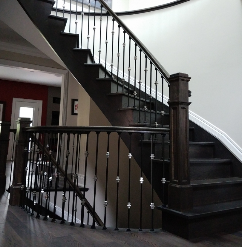 A traditional stair design that ends up looking quite contemporary – this grand circular stair system is enhanced by its wood & metal railing system featuring 1/2″ square satin black metal pickets with patterned brushed nickel collars which adds some pop to the whole affair.  The stair has our standard 1 1/8” thick solid treads with curved veneer stringers, all in flat cut red oak materials and stained to match the clients selected flooring (all finishing by others).  It makes a great first impression upon entering the home.