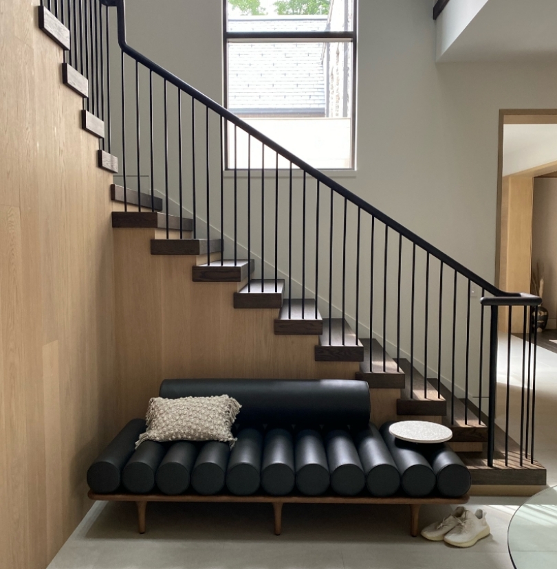 Located on the shores of Lake Simcoe north of Toronto, this project is a beautiful example of transitional design with it’s simple and clean but elegant component elements.  The railing system features a continuous white oak handrail with plain round metal pickets and posts, evoking the less-is-more philosophy of modern design while remaining true to its more traditional rural setting.  The stairs follow the same intent, not overly complicated but thoughtfully considered with an open stringer one side which encourages the passage of light throughout.